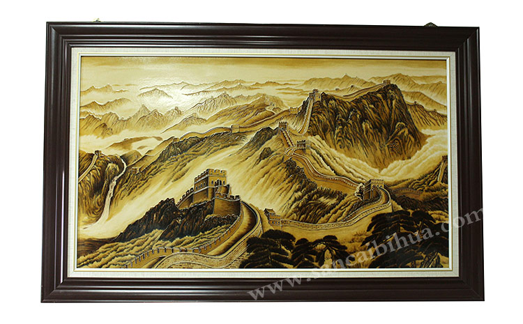 這是上海一個客戶為自己別墅定制的“萬里長城”瓷板畫,全長300cm;高度150cm,尺寸是按照客戶要求訂做。瓷板畫整體顏色偏暗一些,焦黃色作為主色,整體風格符合客戶別墅的中式裝修。